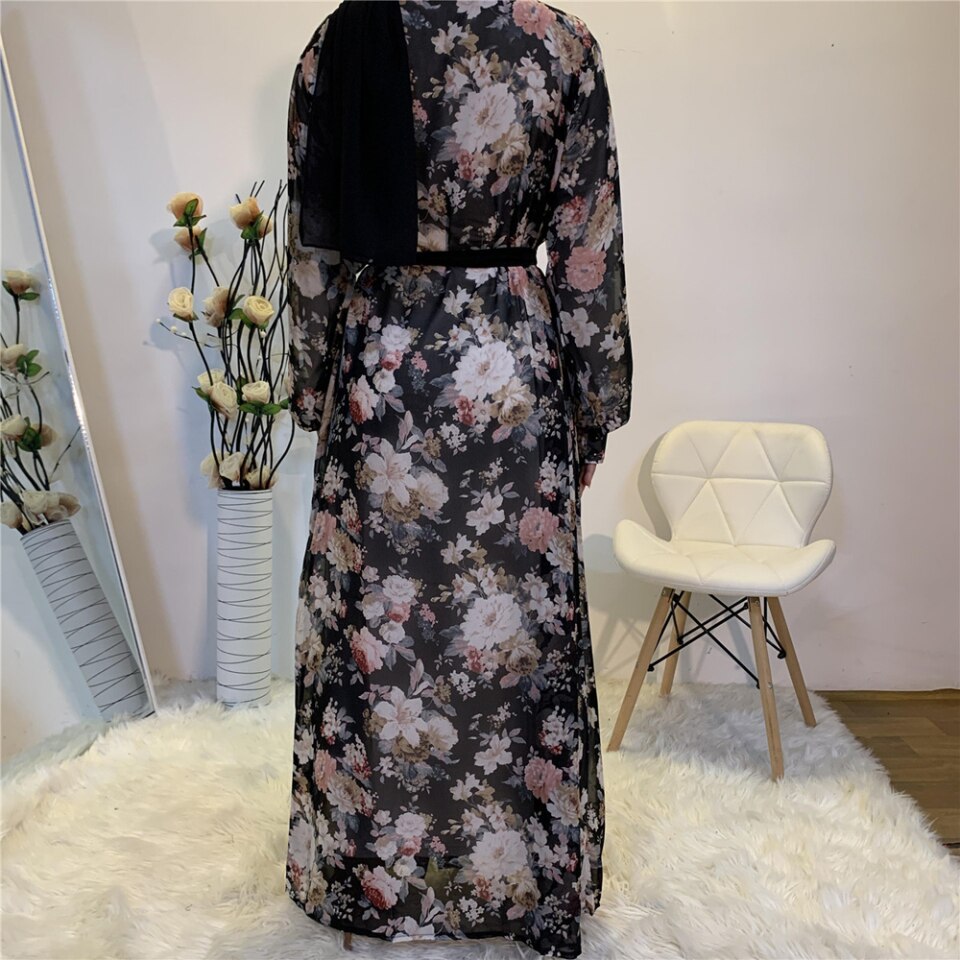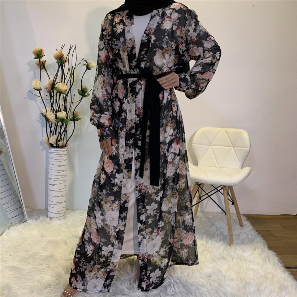 Kimono signifie « chose à porter » et ce kimono ouvert abaya est certainement la « chose à porter » en 2021, en mousseline de soie, le matériau parfait en raison de ses qualités légères et aérées, il met en valeur l’œuvre florale qui met en valeur les fleurs japonaises indigènes, nous avons a pris le kimono et l’a transformé en une abaya de pure élégance en utilisant de la mousseline de soie imprimée du motif floral le plus fantastique.