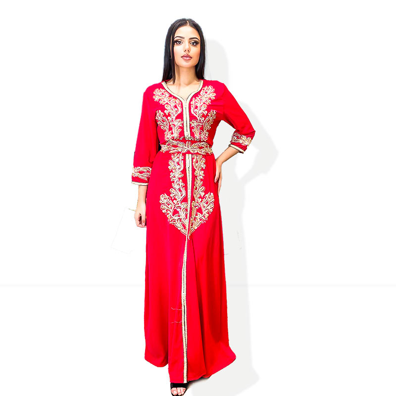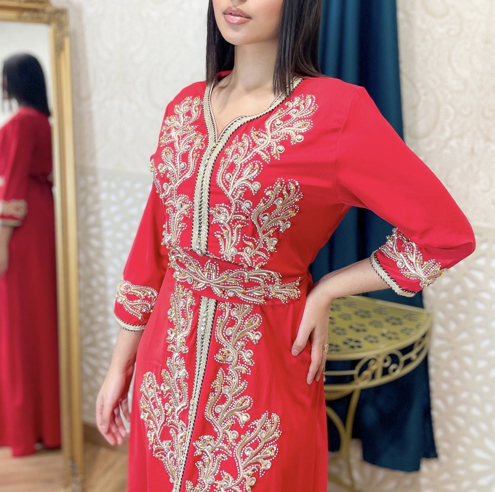 Nos caftans sont fabriqués avec les meilleurs matériaux de soie, magnifiquement brodés et dorés avec des ornements et des strass, la finition parle d’elle-même. Un caftan marocain haut de gamme que vous ne trouverez nulle part ailleurs. Un joli caftan marocain parfait pour vos fiançailles ou pour d’autres occasions spéciales.