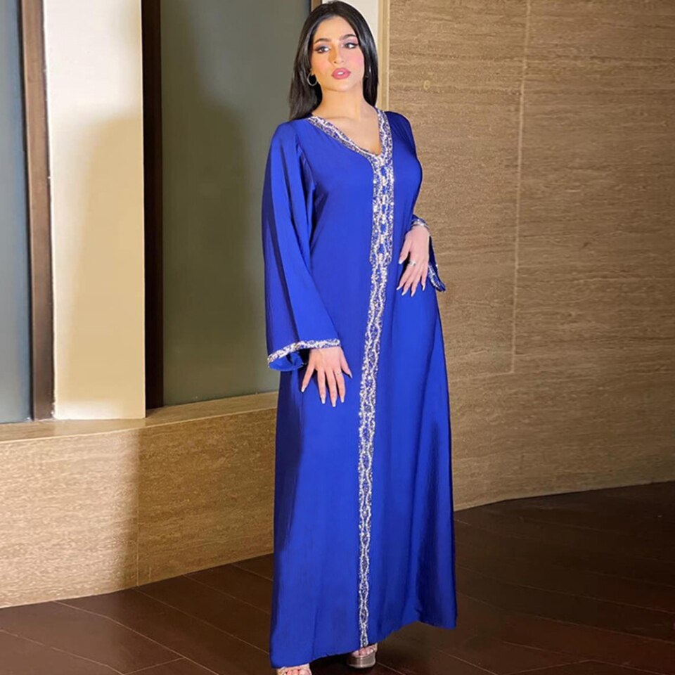 Magnifique robe marocaine nommé la Bella tusinisienne de couleur bleu grande taille pour un confort maximum dans son domicile. Cette robe djellaba est désormais également disponible en couleur bleu nuit