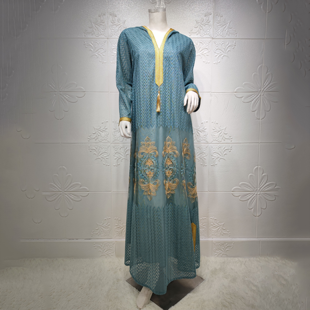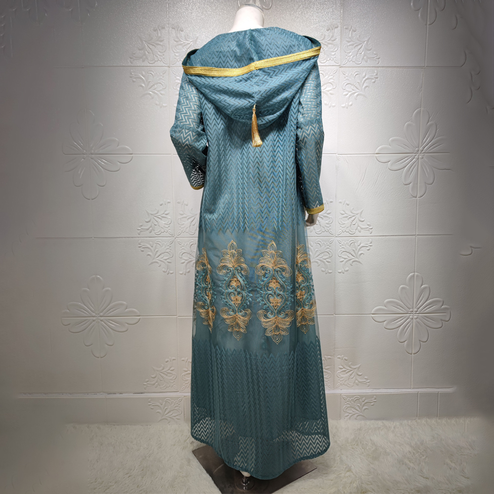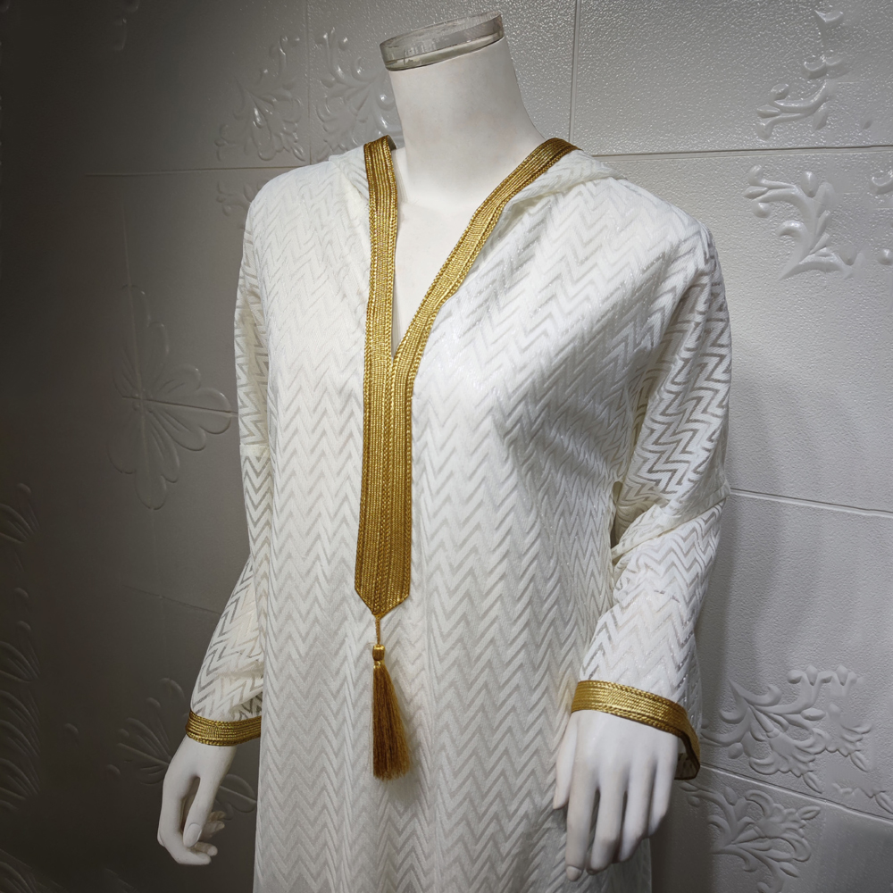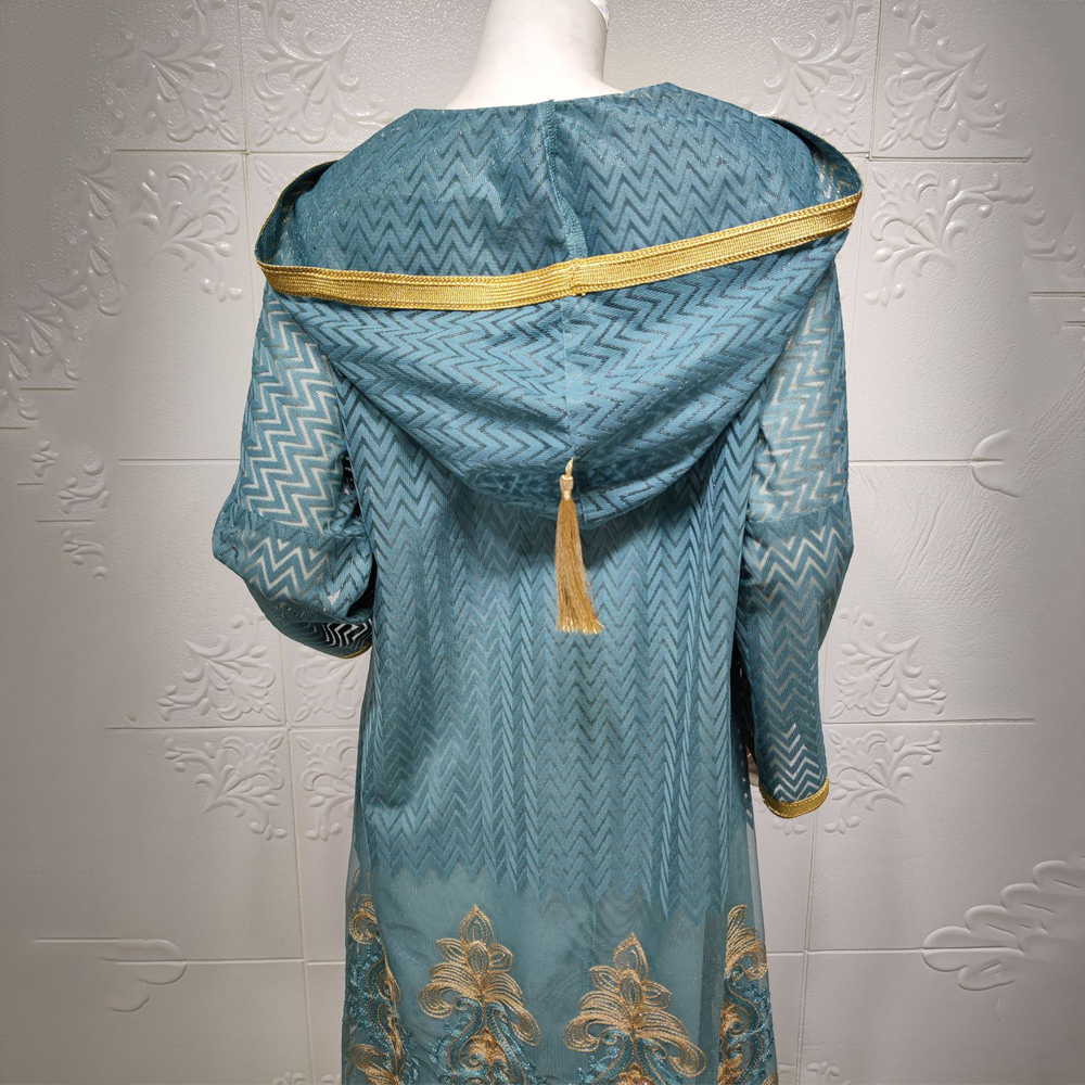 Avec un aspect plutôt orienté A-line et ample, elle vous procure à la fois un confort tout en vous gardant une liberté de vos mouvements. La djellaba arbore aux extrémités la broderie traditionnelle du Maroc en couleur dorée avec un pompon au centre et derrière la capuche complété par des motifs de la Kasbah traditionnelle sur la partie base de la robe. On retrouve une fente sur chaque côté que vous aimez tant. L’ensemble est en maille, par-dessous une robe opaque et transparente sur les bras. Un must pour votre garde-robe.