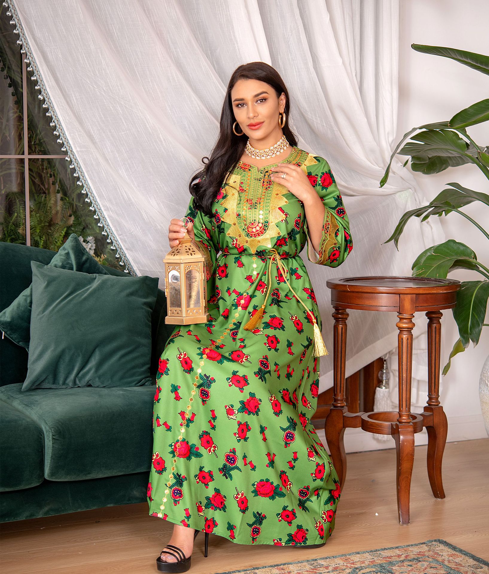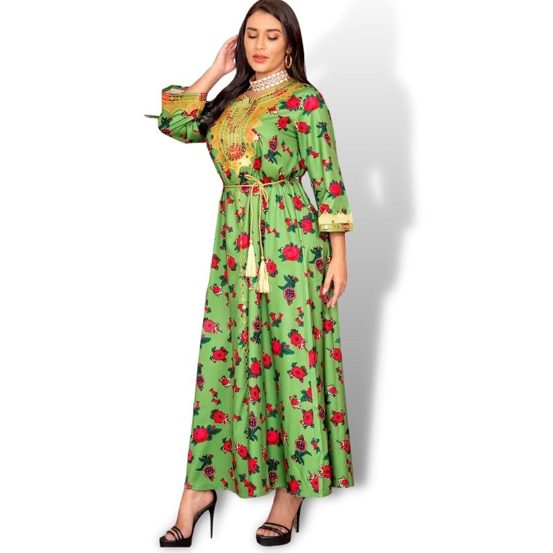 Robe djellaba pour femme de couleur vert, avec des motifs à fleur. Egalement disponible en coloris jaune et bleu.