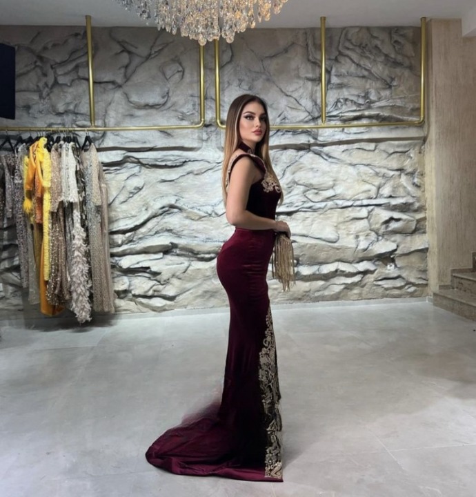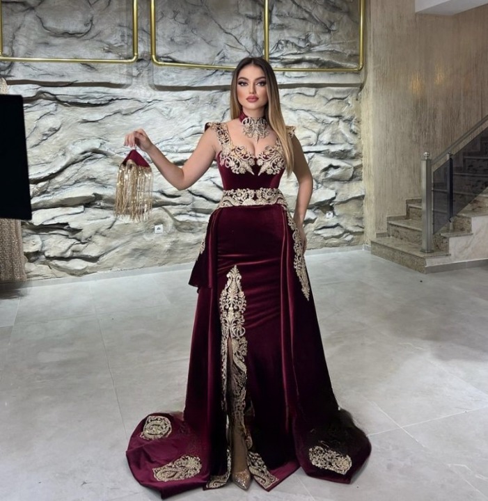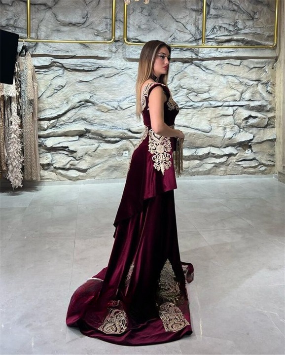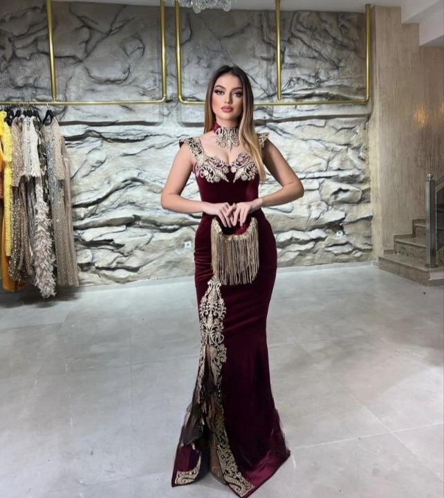 Robe de soirée en velours bleu océan pour femmes à porter avec l’une de nos bijoux arabes